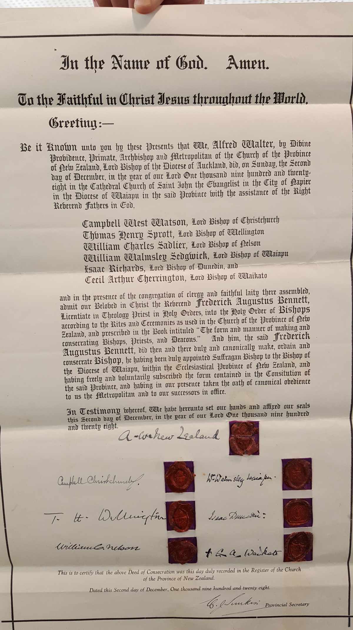 Papers recently received from a diocesan archive, where they had been placed for safekeeping in the 1940s, reveal the Consecration Deed for Bishop Frederick Augustus Bennett, first Bishop of Aotearoa, as well as the various declarations he had to sign as suffragan bishop to the Bishop of Waiapu. The bishops of all the New Zealand Dioceses were also signatories to the Deed.