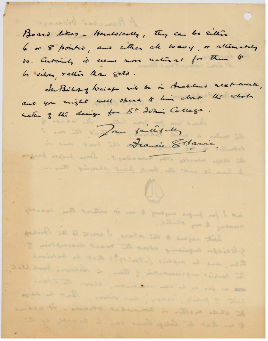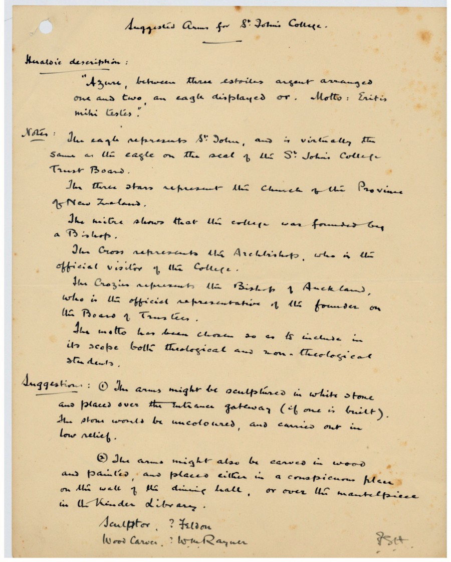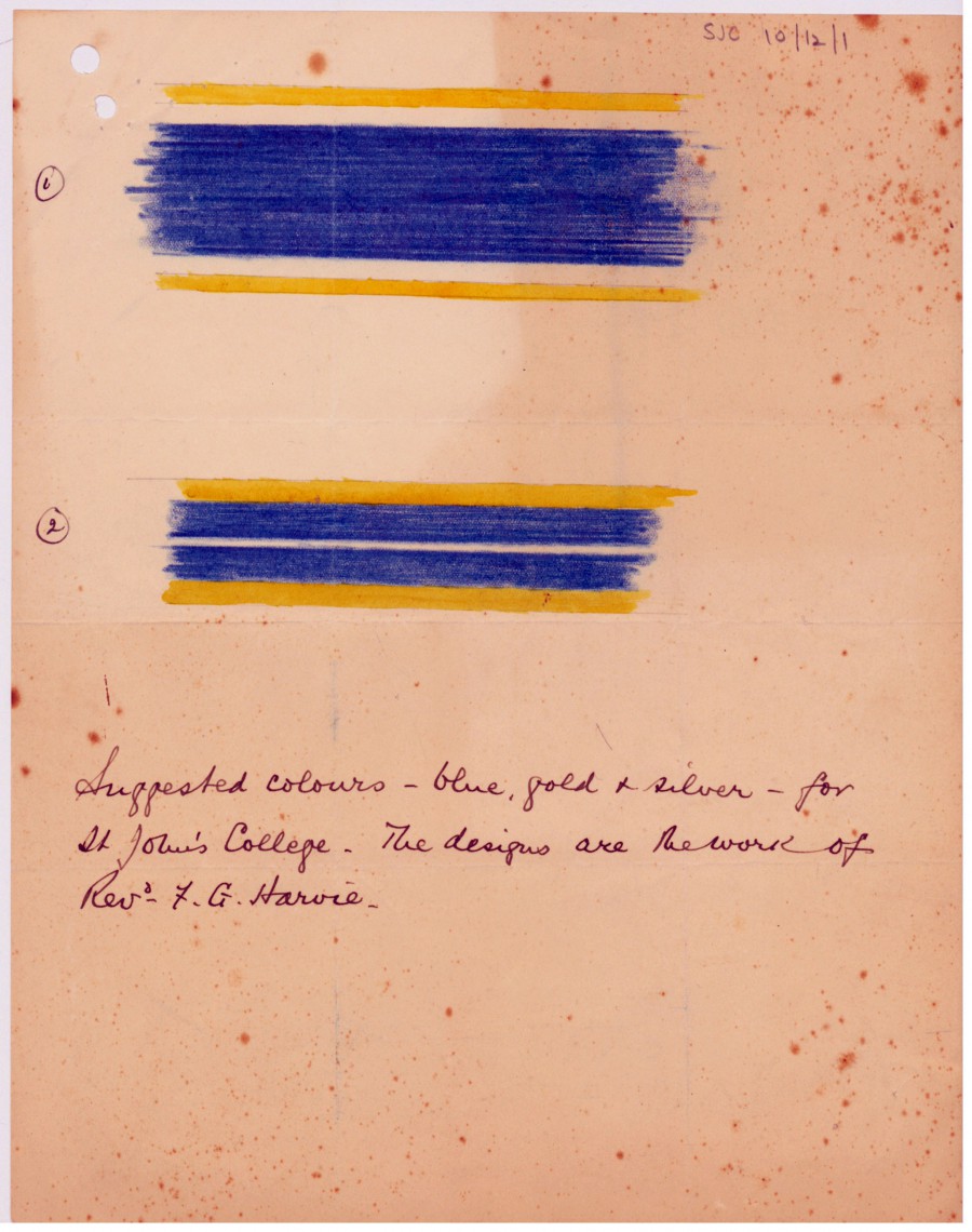 The St John’s Flag and Coat-of-Arms dates back to the 1930s and evidence suggests it was designed by a college student, Francis Graham Harvie or at least based on his designs for the College coat-of-arms and colours (“blue, gold and silver”). Archival material held in the collections relate to F. G. Harvie’s design of the coat-of-arms for the college and a letter to Archdeacon Simkin, then Secretary to the St John’s College Trust Board, with his suggestions.